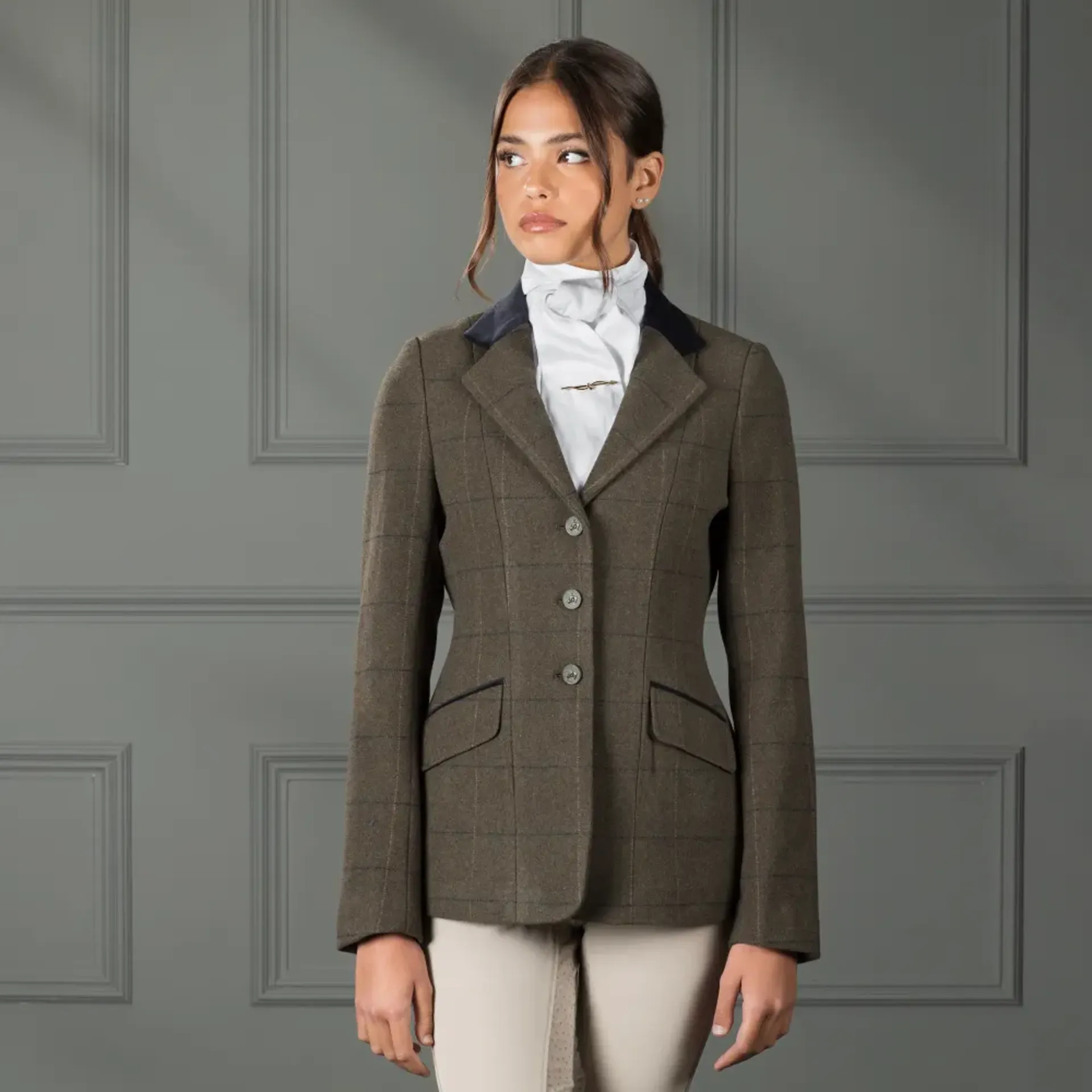 Classic wool-rich tweed jacket with a tailored fit, velvet trim, satin lining, and rear vents. Ideal for showing, competitions, or smart country wear.