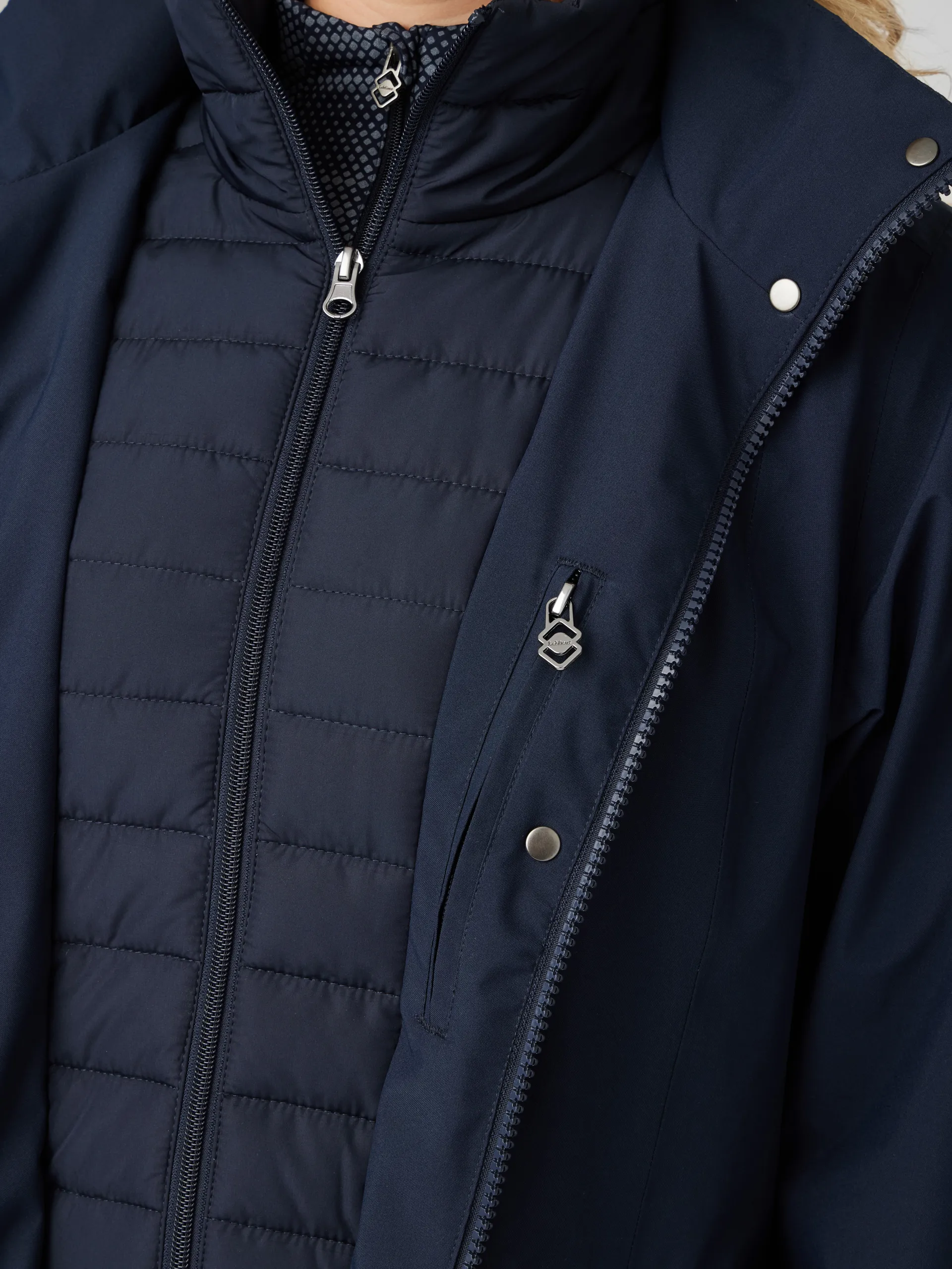 A long, waterproof women’s riding coat designed to keep you dry, warm and comfortable on winter rides. It features fully taped seams, a detachable hood, and a two-way front zip for ease when riding. The coat has a full-length silhouette for extra coverage and internal leg straps so you can sit in the saddle without restriction. Quilted panels with zipped opening add warmth when needed, and reversible cuffs plus a rear zip opening reveal subtle reflective detailing - useful for low-light visibility